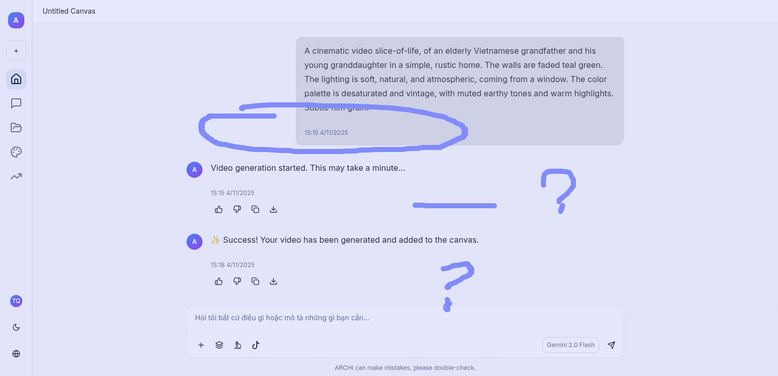 Lúc em tạo xong thì xuất ảnh ra canvas, em lỡ ấn tắt canvas thì ở box chat cũng mất ảnh đã tạo, không xem lại ảnh được